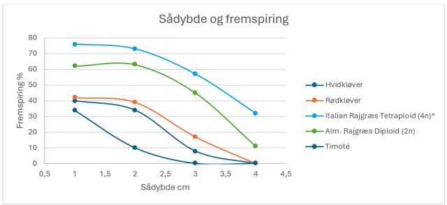 Som du kan se i Figur 2, falder fremspirings-procenten hurtigt ved øget sådybde i småfrøede arter som timoté og hvidkløver, mens storfrøede arter som tetraploid italiensk rajgræs tåler dybere såning.